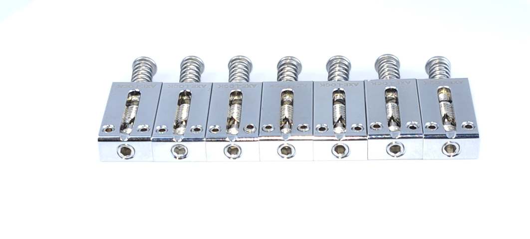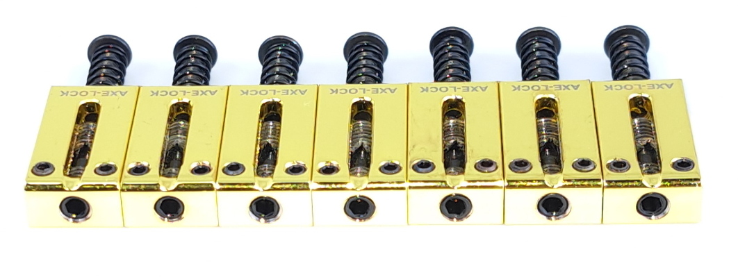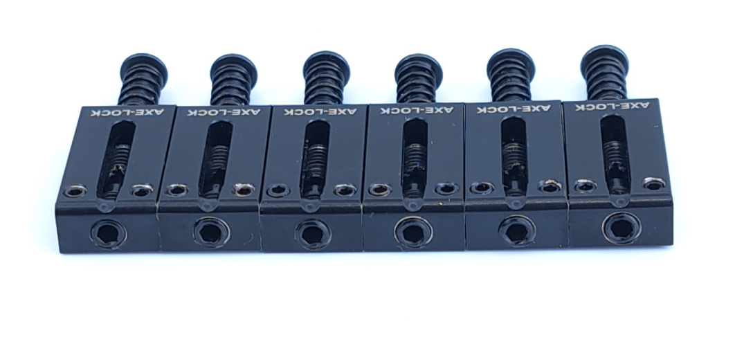 Insert the AXE-LOCK systems on each tuning post and adjust the grub screws (A) slightly inward as required to avoid popping out in case a string breaks or when replacing strings.