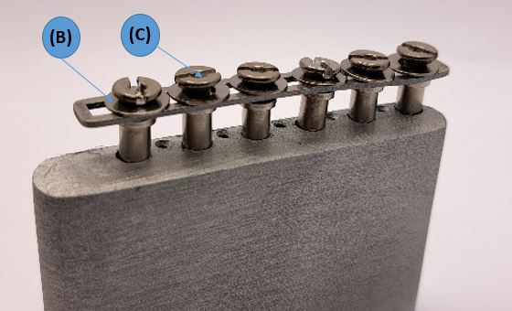 Once in place, it is time to fit the strings in each position (B) (starting with the D string is recommended to hold the plate in place), locking them in place between each washer and the holding plate with the 2.5mm hex-key provided.