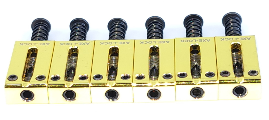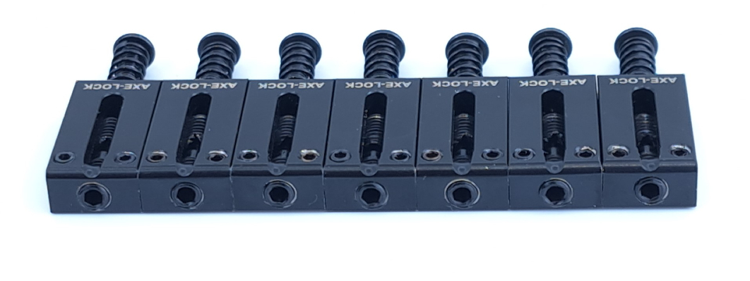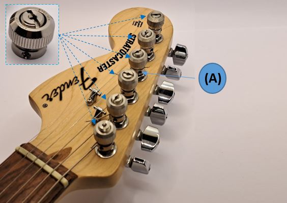 Insert the AXE-LOCK systems on each tuning post and adjust the grub screws (A) slightly inward as required to avoid popping out in case a string breaks or when replacing strings.