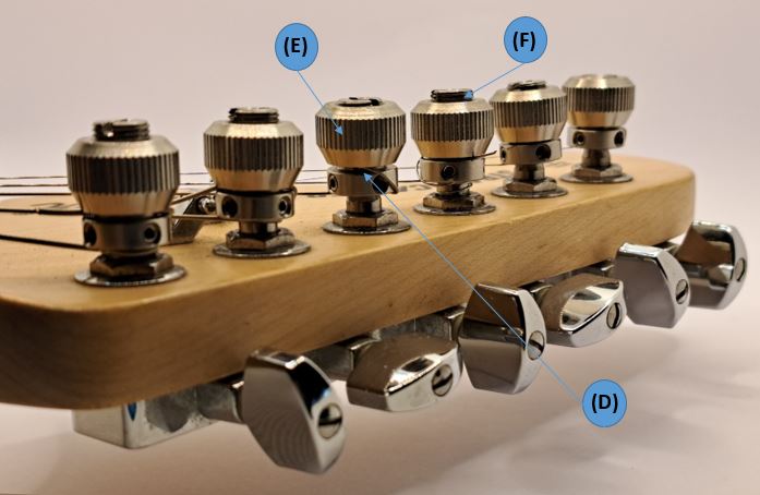 Lock the strings manually using the Knurled Heads (E) and tighten the top component (F) for extra security using the 2.5mm hex-key provided.