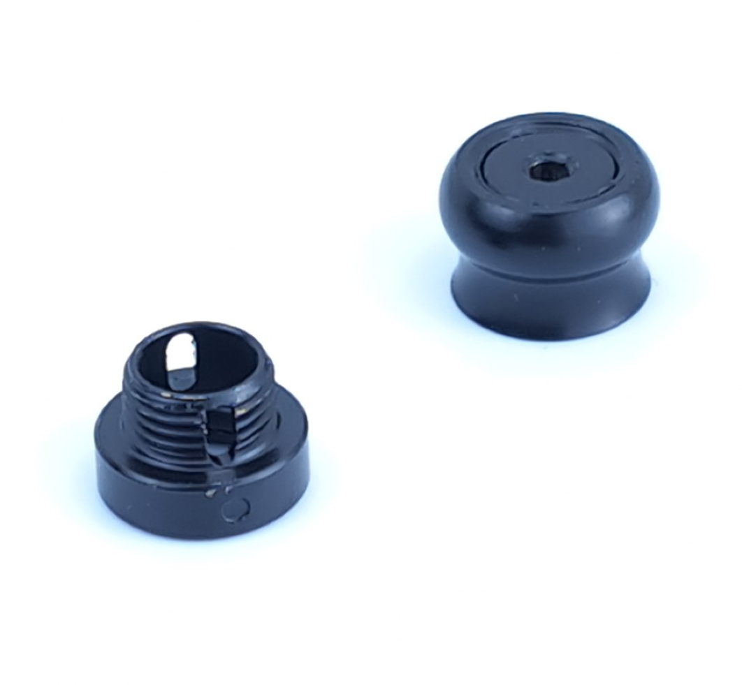 Includes fastening via screws and push-in system with O-Ring locking mechanism to stay in place even in the abcense of any string.
